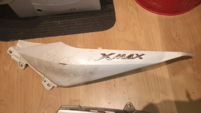 Detalles del productoSe vende Cacha lateral para Yamaha XMAX 125 y 300. Pieza de plástico blanco con el logo XMAX plateado.