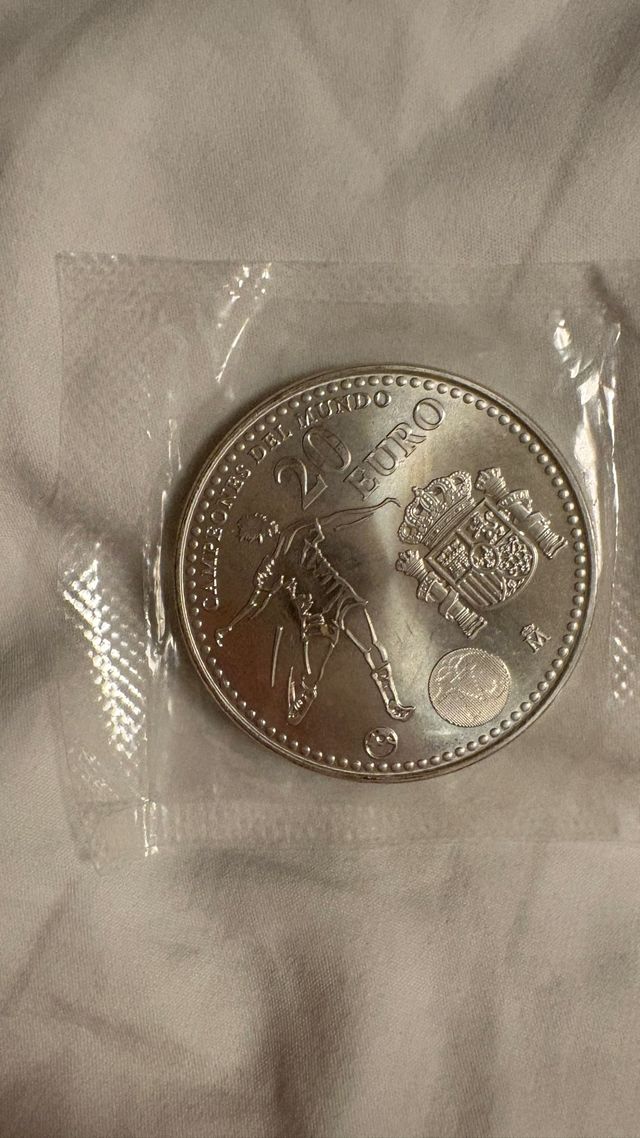 Moneda conmemorativa de 20 euros. - Diseño de Campeones del Mundo. - Incluye escudo de España. - Detalle de futbolista. - Borde con puntos.