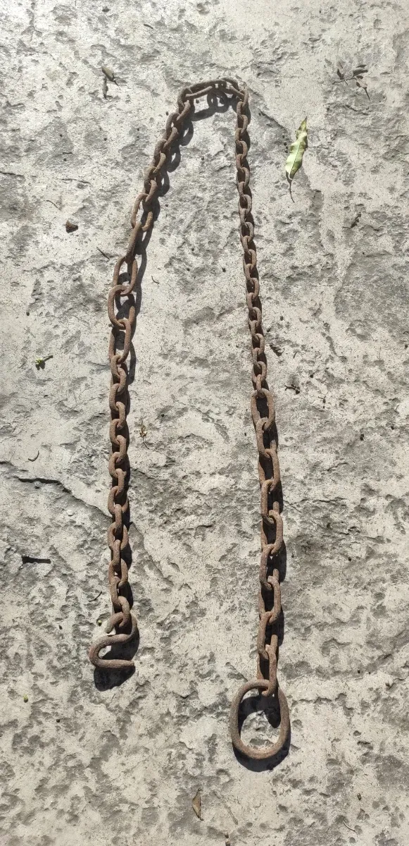 Cadena de hierro con un acabado rústico y antiguo. Ideal para decoración o proyectos. - Material: Hierro. - Incluye una anilla en un extremo.