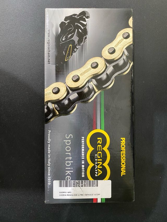 Detalles del productoCadena Regina 525 Ultra para moto, con 118 pasos y código 137ZRP. Está nueva, en su caja original.