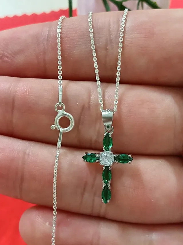 Cadena y Colgante Cruz esmeralda circonitas Plata