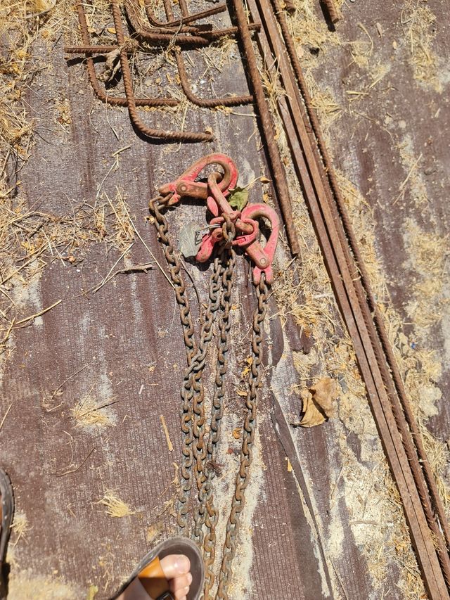 Juego de dos cadenas de amarre con gancho. Son de acero y miden aproximadamente 5 metros cada una. Están usadas pero en buen estado.