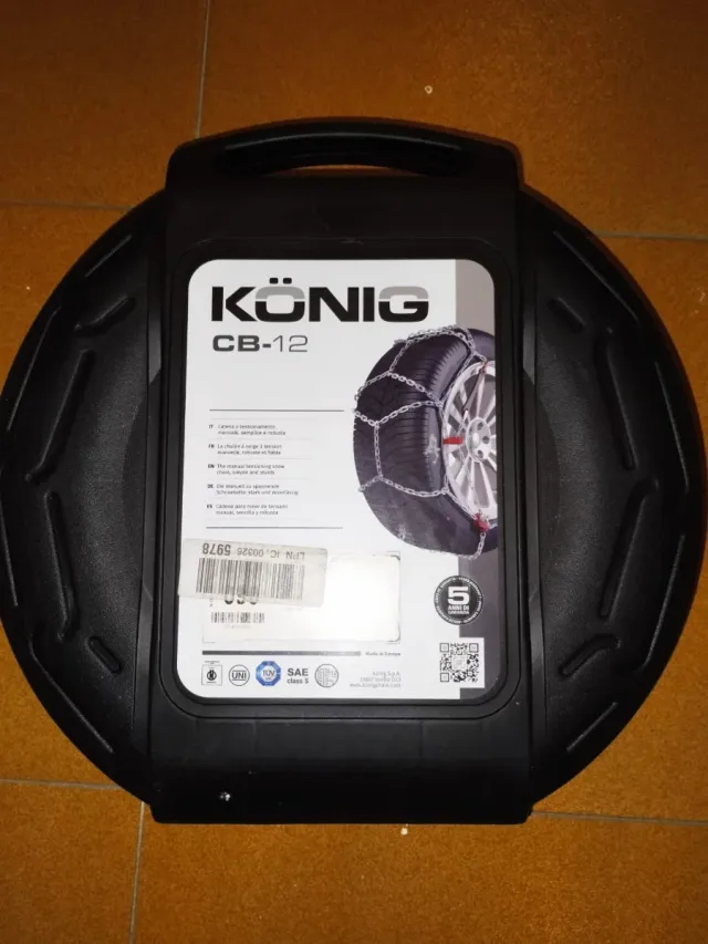 Cadenas para nieve de la marca KÖNIG, modelo CB-12. - Incluye caja de almacenamiento. - Certificación SAE Class S. - Fabricadas en Europa.