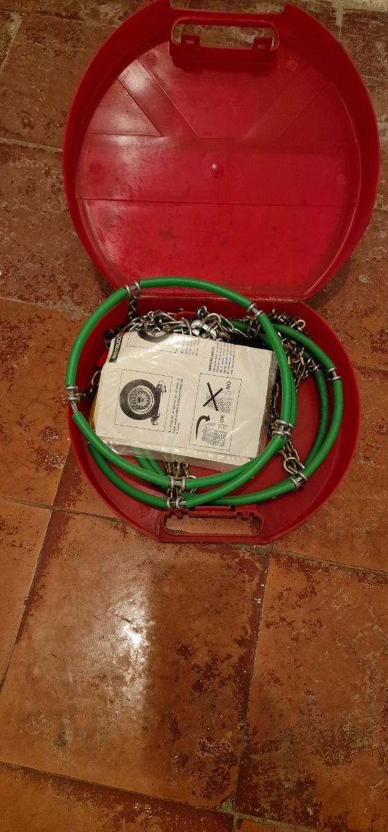 Cadenas de nieve para coche, guardadas en su caja roja. - Incluye instrucciones de montaje. - Diseño con eslabones metálicos y recubrimiento verde.