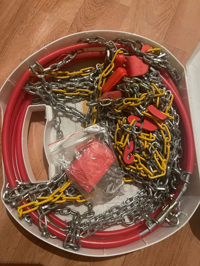 Juego de cadenas para nieve de coche. - Cadenas de metal con eslabones. - Incluye tubos rojos de sujeción. - Viene con bolsa de tela roja y cierre.