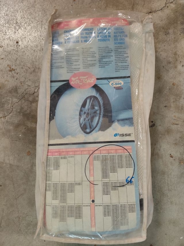 Detalles del productoCadenas de tela para neumáticos de coche sin uso. Homologadas. ideales para circular con seguridad en condiciones de nieve y hielo. Fáciles de instalar.