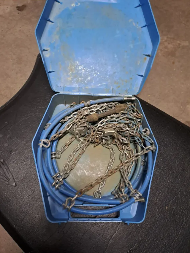 Detalles del productoJuego de cadenas para nieve de coche, diseñadas para mejorar la tracción en superficies resbaladizas. Se guardan en una práctica caja de plástico azul.