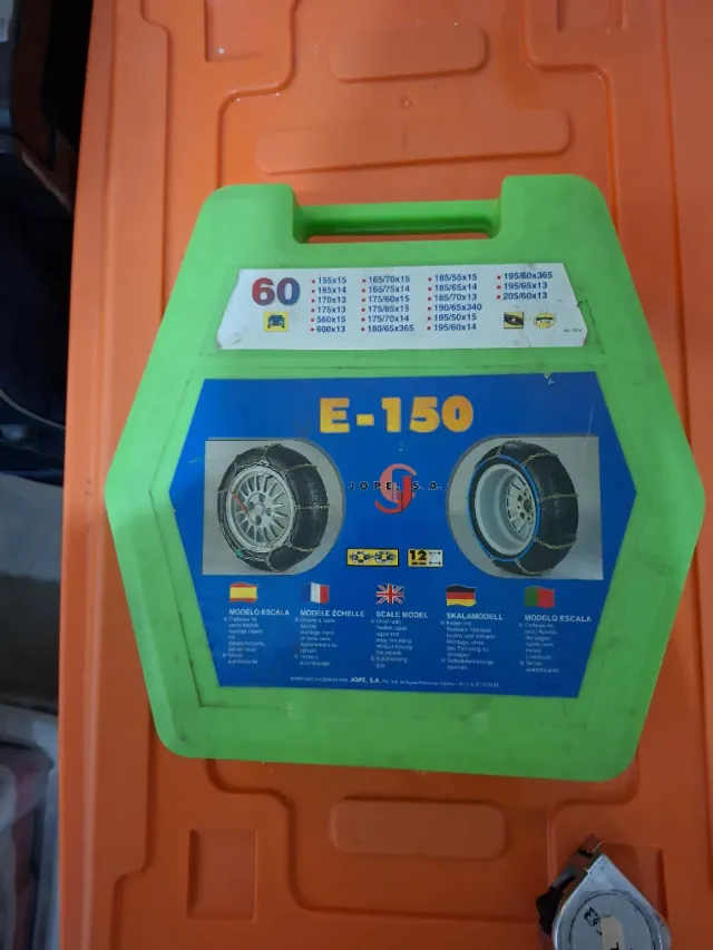 Cadenas para nieve modelo E-150. - Incluye 60 modelos de cadenas. - Compatible con medidas de llanta 15, 14 y 13. - Incluye instrucciones en varios idiomas.