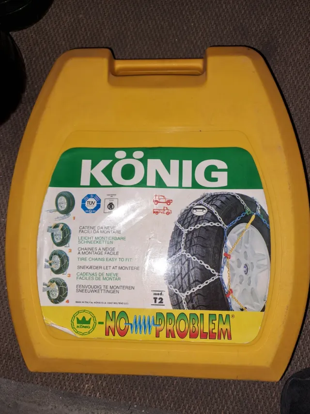 Cadenas para nieve de la marca KÖNIG, modelo T2. - Fácil montaje. - Incluye instrucciones en varios idiomas. - Caja de almacenamiento amarilla.