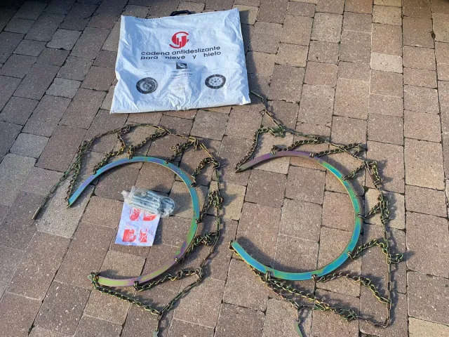 Juego de cadenas para nieve y hielo, diseñadas para mejorar la tracción en superficies resbaladizas.