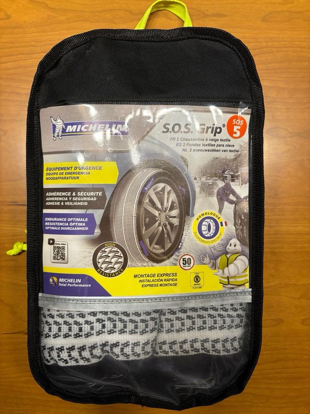 Cadenas textiles sos 5 de la marca michelin, nuevas a estrenar. Las vendo por cambiar de coche pvp80€ Estan las medidas de los neumaticos comparibles en la segunda foto