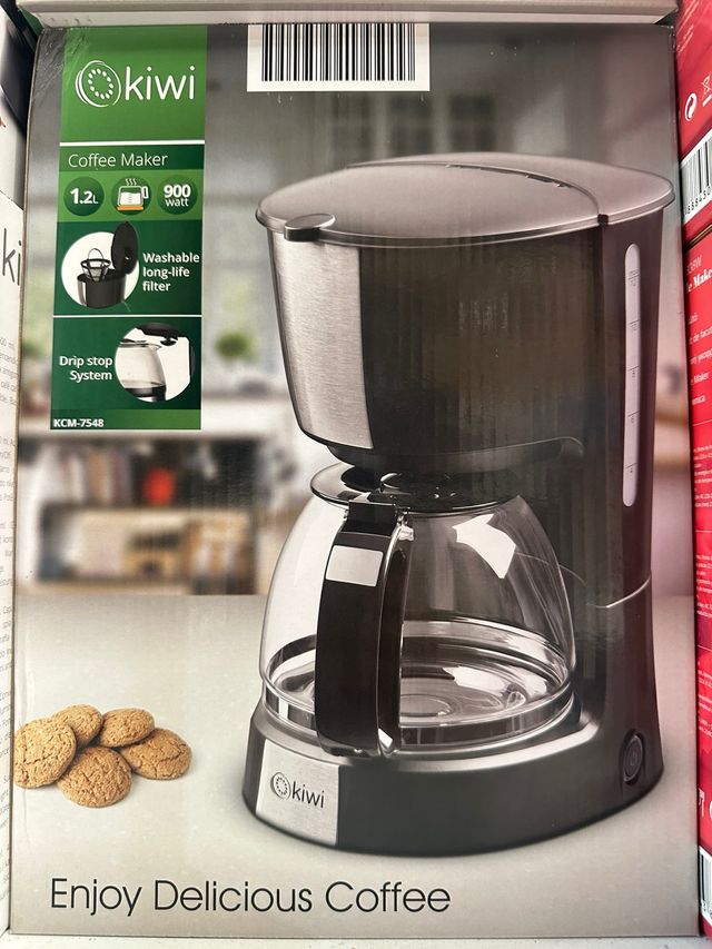 Cafetera eléctrica Kiwi con capacidad de 1.2 litros y 900 vatios de potencia. - Filtro lavable y de larga duración. - Sistema antigoteo. - Modelo KCM-7548.