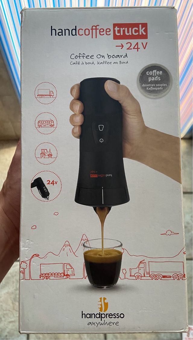 Detalles del productoSe vende cafetera handcoffe truck 24v para camion, perfecta para hacerte un cafe cuando y donde quieras en el camion. Funciona con capsulas que venden en cualquier supermercado y agua. En perfecto estado y se completa con su caja, manual de instrucciones y demas.