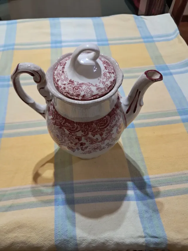 Detalles del productoCafetera antigua de La Cartuja de Sevilla de más de cien años,con un diseño floral en color burdeos y un bonito craquelado que le ha dado el paso del tiempo.