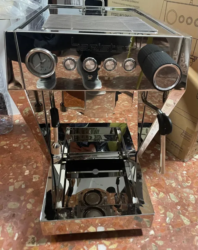 Cafetera de espresso profesional de la marca Baristeo Brava. - Acabado cromado brillante. - Manómetro para control de presión. - Diseño elegante y robusto.