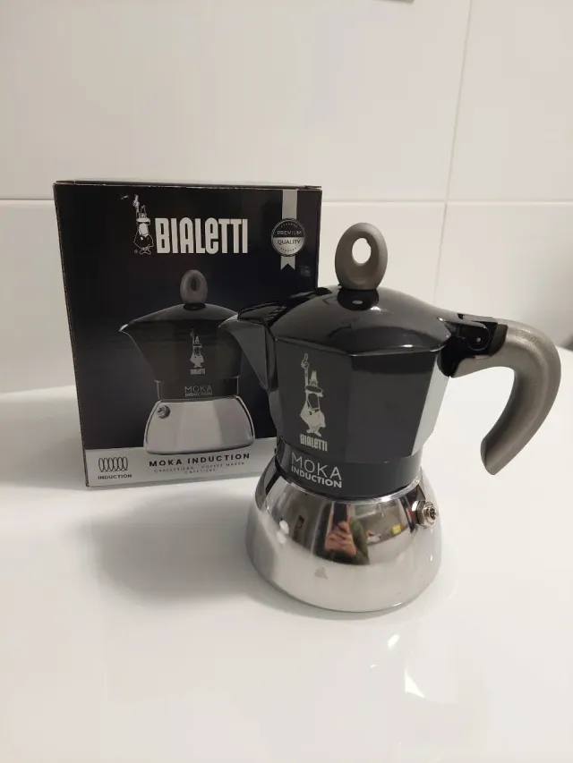 Cafetera italiana Bialetti Moka Induction, diseñada para 4 tazas. - Color negro y plateado. - Apta para cocinas de inducción.