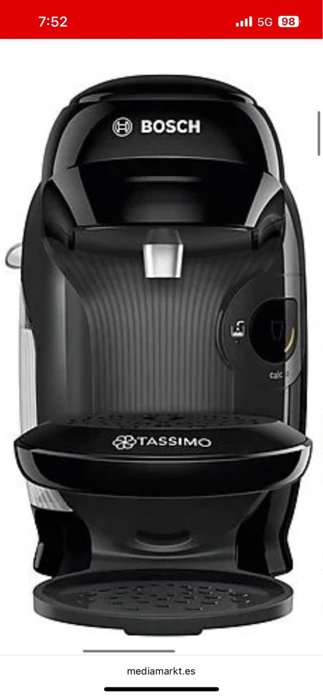Detalles del productoCafetera de cápsulas Bosch Tassimo en color negro. Diseñada para preparar bebidas calientes de forma rápida y sencilla.