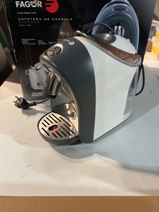 Cafetera de cápsulas Fagor Stracto en color blanco y gris. - Modelo CCA-15G. - Diseño moderno y compacto. - Bandeja extraíble.
