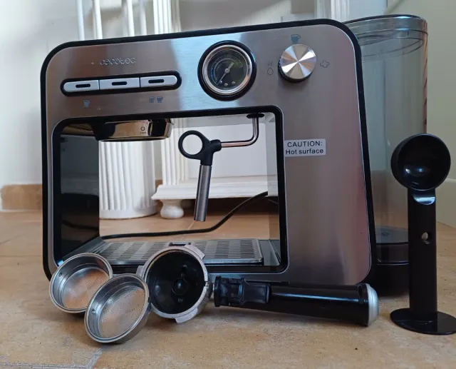 Cafetera de Cecotec, modelo Cumbia. Ideal para preparar café en casa. - Diseño moderno en acero inoxidable. - Incluye portafiltros y accesorios. - Depósito de agua extraíble.