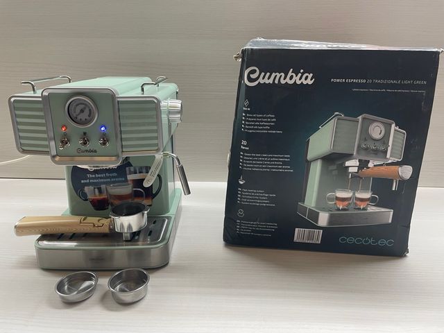 Detalles del productoCafetera Cecotec Cumbia Power Espresso 20 en color verde claro. Esta en buen estado, con los accesorios que se ven en la imagen.
