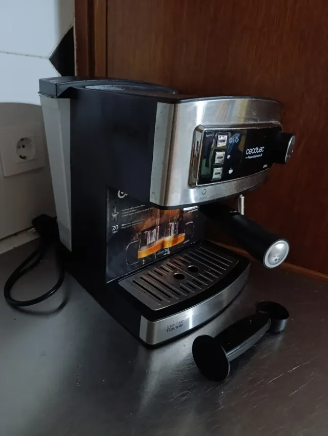 Detalles del productoCafetera de espresso Cecotec con acabado plateado y negro.