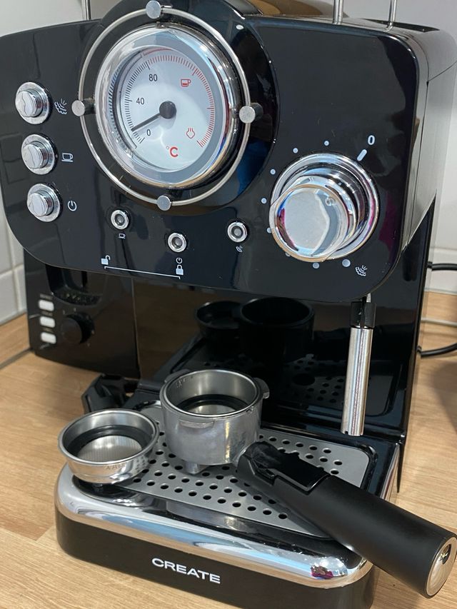Detalles del productoCafetera de goteo y espresso de la marca Create. Diseño moderno en color negro con detalles cromados.