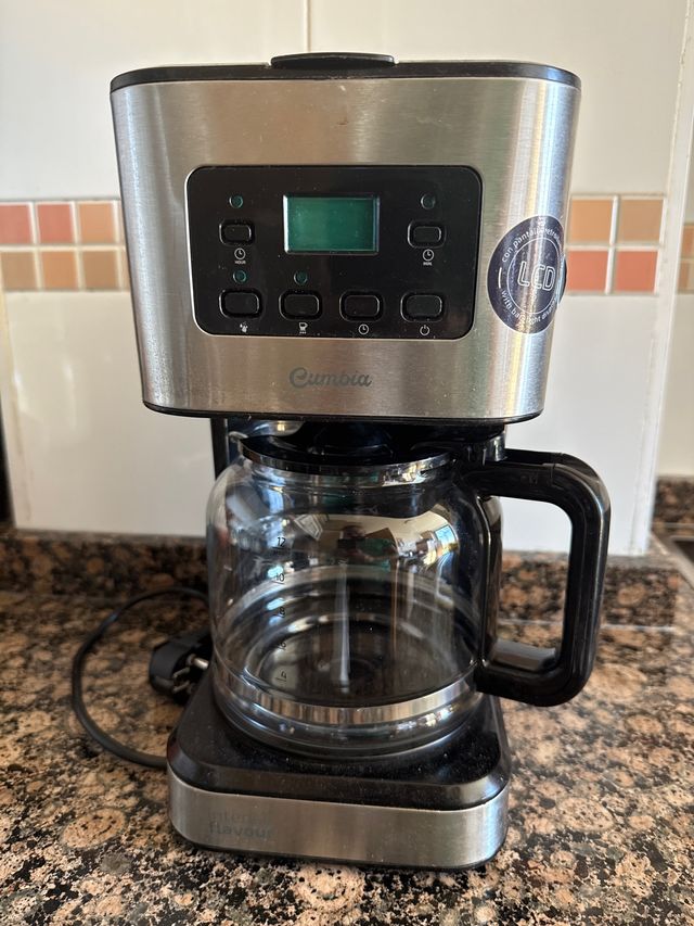 Detalles del productoCafetera de goteo Cumbia con panel digital y jarra de cristal.