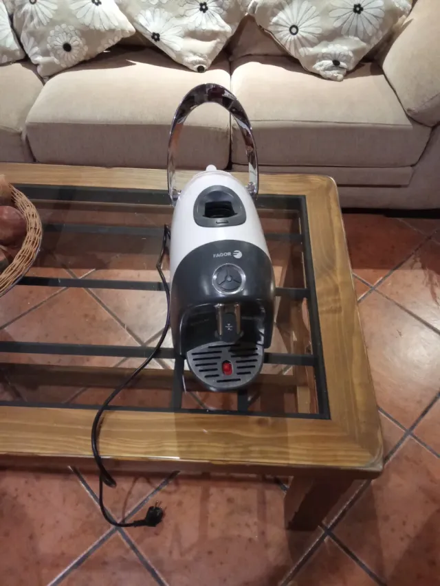 Cafetera de cápsulas Fagor en color blanco y gris. - Diseño moderno y compacto. - Asa cromada para facilitar su transporte. - Bandeja extraíble para una limpieza sencilla.