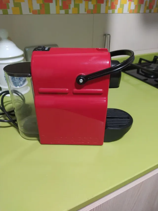 Cafetera de cápsulas en color rojo, con un diseño moderno y compacto. - Depósito de agua extraíble. - Bandeja recogegotas. - Asa para apertura superior.