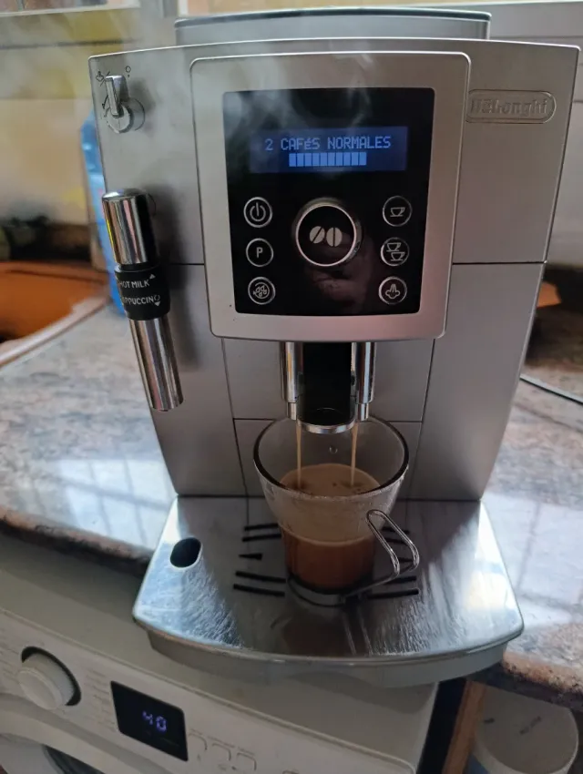 Detalles del productoCafetera automática DeLonghi en acabado plateado. Perfecta para preparar cafés de forma rápida y sencilla.