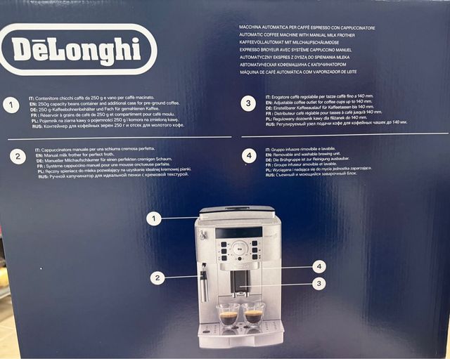 Detalles del productoCafetera automática DeLonghi para preparar espresso y capuchino.