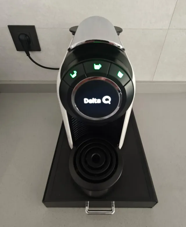 Cafetera de cápsulas Delta Q en color blanco y negro. Diseño moderno y compacto. - Pantalla digital. - Botones táctiles. - Bandeja extraíble.