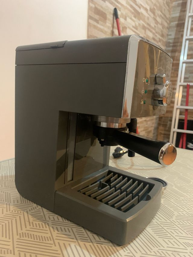 Cafetera espresso en color gris oscuro, en buen estado. - Diseño compacto y elegante. - Incluye portafiltro. - Bandeja recogegotas extraíble.