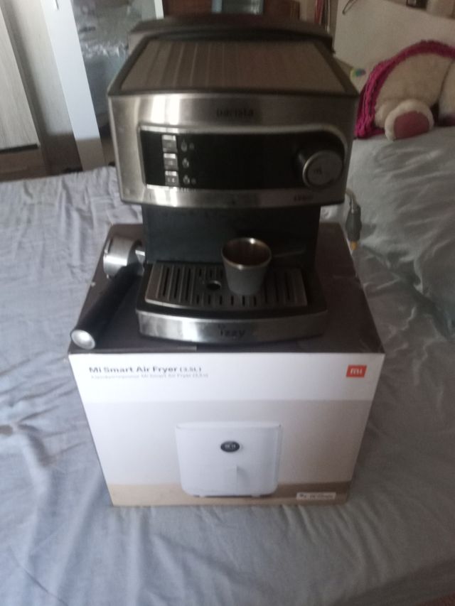 Detalles del productoCafetera espresso de estilo moderno, ideal para preparar café en casa. Su diseño combina acero inoxidable y detalles en negro.