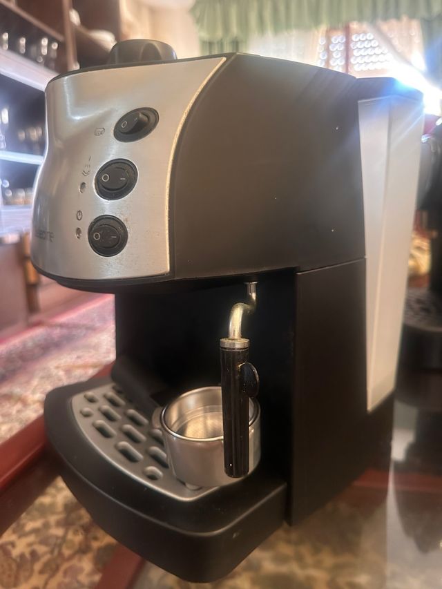 Detalles del productoCafetera de espresso con un diseño moderno en color negro y detalles plateados.