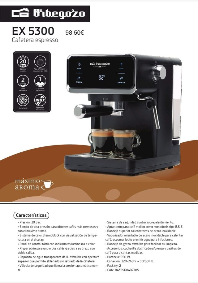 Detalles del productoCafetera espresso Orbegozo EX 5300 en color negro. Diseño moderno con panel de control táctil.