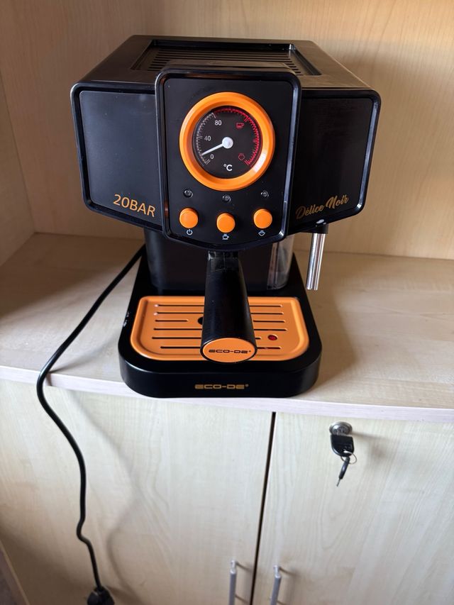 Detalles del productoCafetera espresso Delice Noir, con un diseño elegante en negro y detalles naranjas.