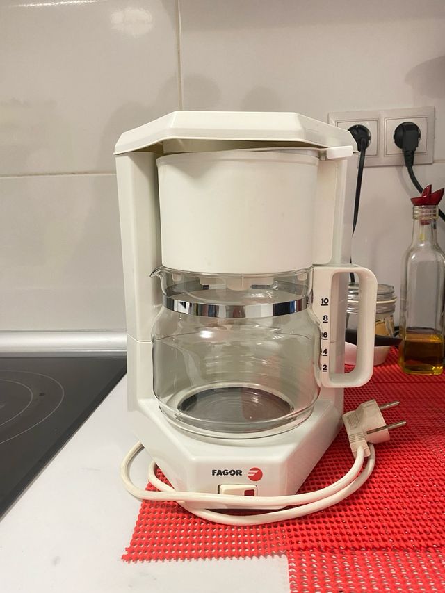 Cafetera eléctrica de la marca Fagor, con un diseño en color blanco. - Jarra de cristal. - Indicador de nivel de agua.