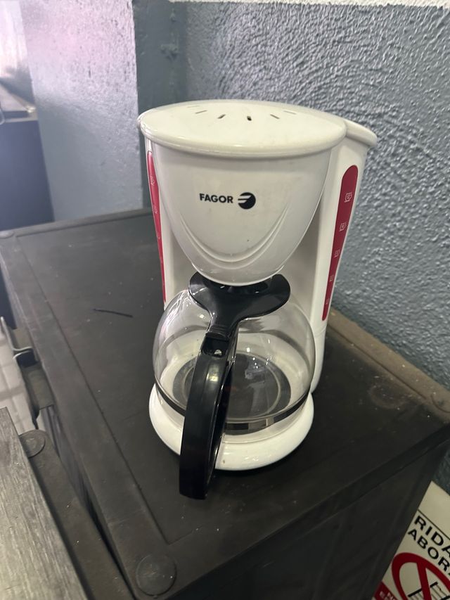 Cafetera de goteo de la marca Fagor. Su diseño es blanco con detalles en rojo y un jarra de cristal. - Capacidad para varias tazas. - Indicador de nivel de agua.
