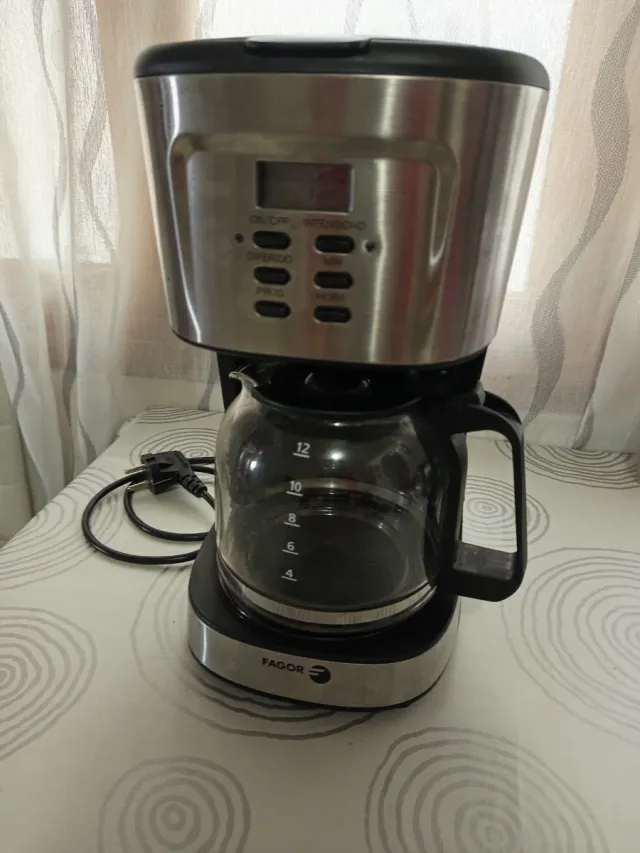 Cafetera de goteo con panel digital y jarra de cristal. - Panel de control con botones. - Indicador de nivel de agua en la jarra. - Base antideslizante.