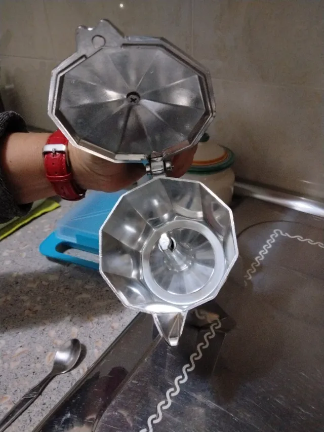 Cafetera italiana de aluminio, perfecta para preparar café. - Material: Aluminio. - Diseño octogonal clásico.