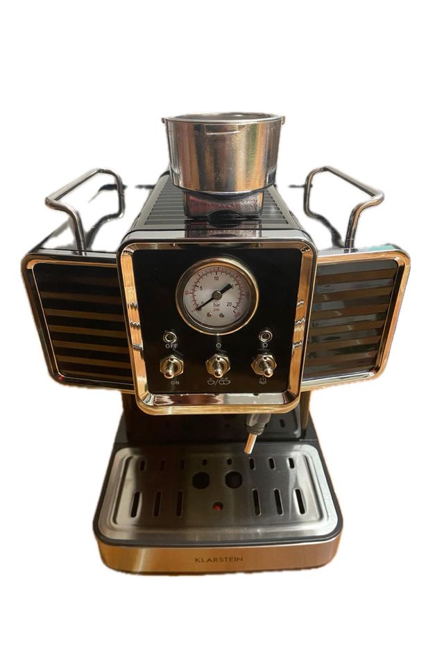 Cafetera de la marca Klarstein, sin estrenar. Diseño elegante en color negro con detalles cromados. - Incluye manómetro. - Controles tipo palanca.