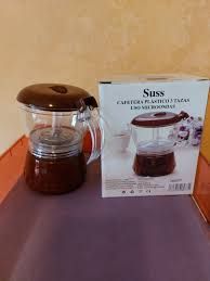Detalles del productoCafetera de plástico Suss para microondas, ideal para 3 tazas. Es de color marrón oscuro y transparente.