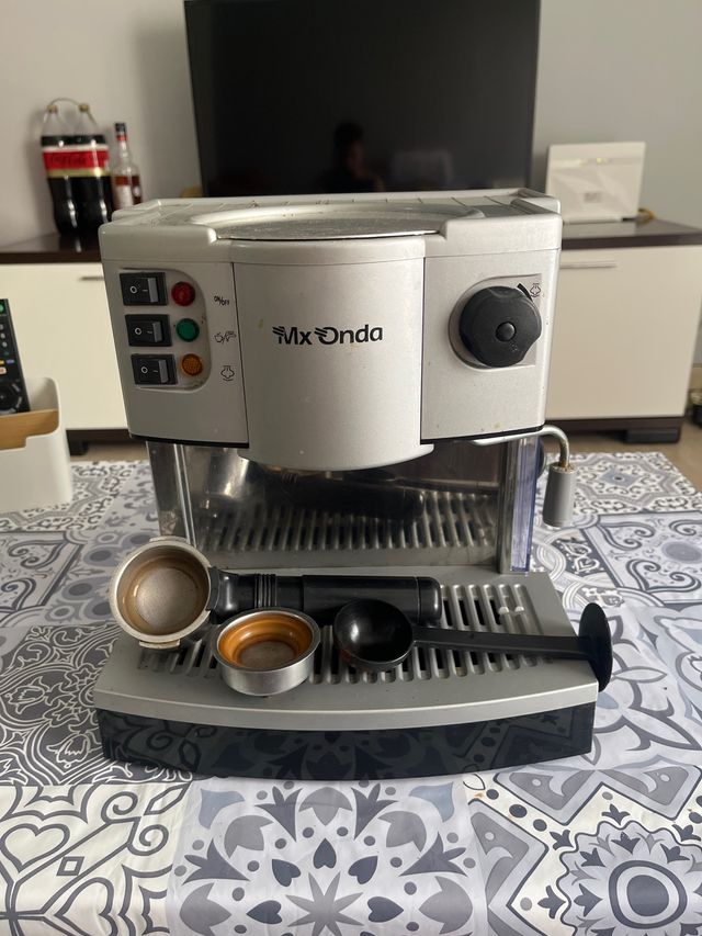 Cafetera de espresso MX Onda modelo MX-CE2281. Diseño plateado y negro. - Incluye portafiltros y cucharilla medidora. - Panel de control con interruptores y dial.