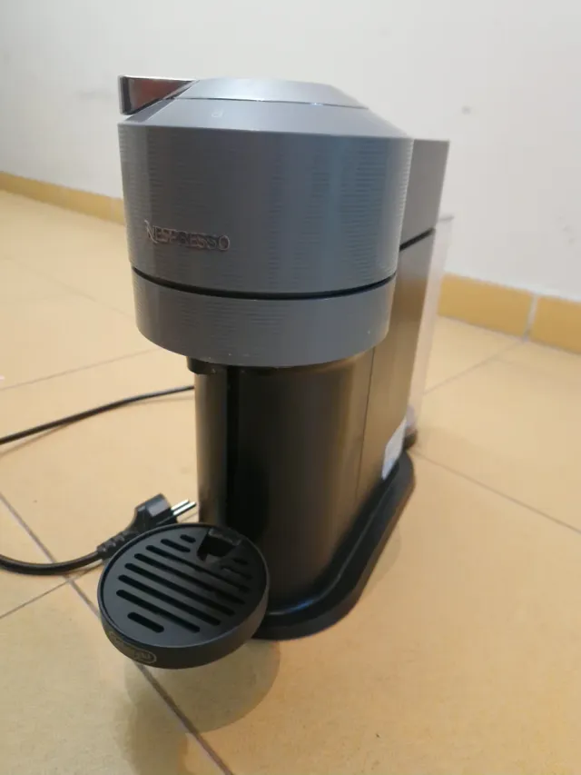 Cafetera Nespresso en color gris y negro, con su bandeja recogegotas. - Incluye varias cápsulas de café. - Diseño moderno y compacto.