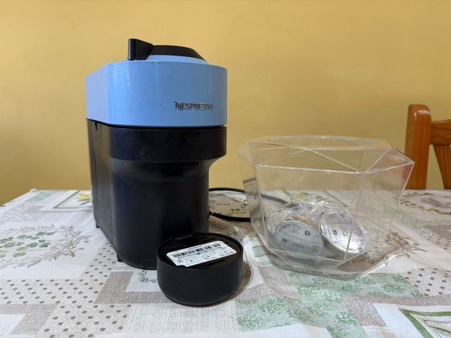 Detalles del productoCafetera Nespresso de color azul y negro. Incluye un recipiente transparente para cápsulas y un paquete de cápsulas.