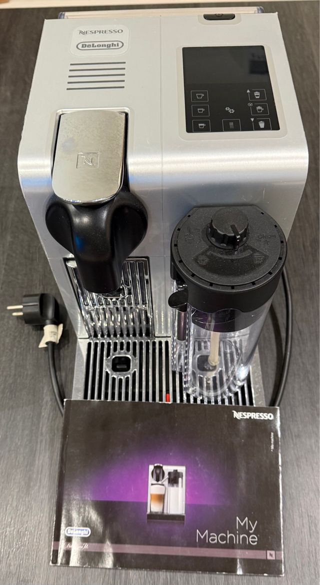 Detalles del productoCafetera Nespresso DeLonghi en color plateado. Incluye manual de instrucciones.