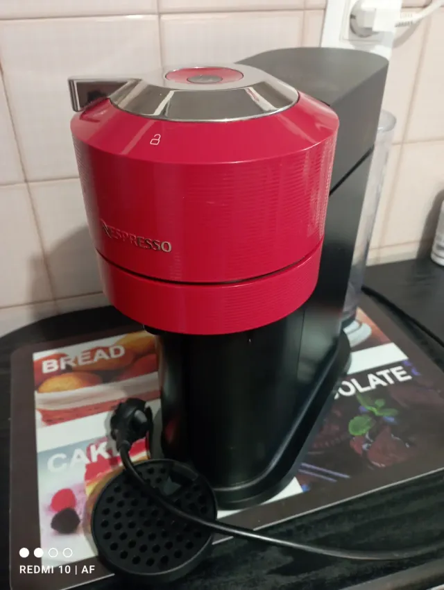 Cafetera Nespresso de color rojo, con un diseño moderno y compacto, en buen estado por cambiar a otro modelo - Depósito de agua. - Bandeja recogegotas.