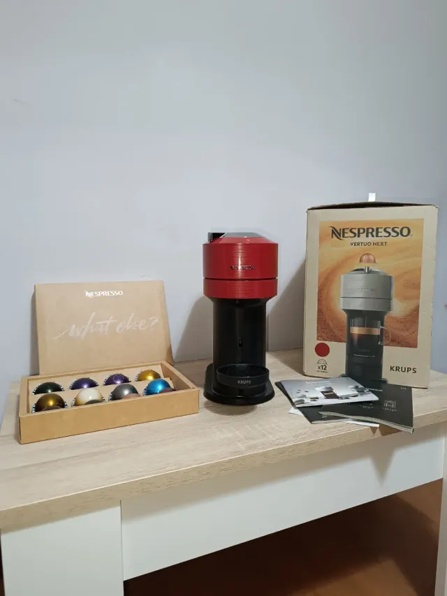 Cafetera Nespresso Vertuo Next en color rojo. Incluye cápsulas de café.