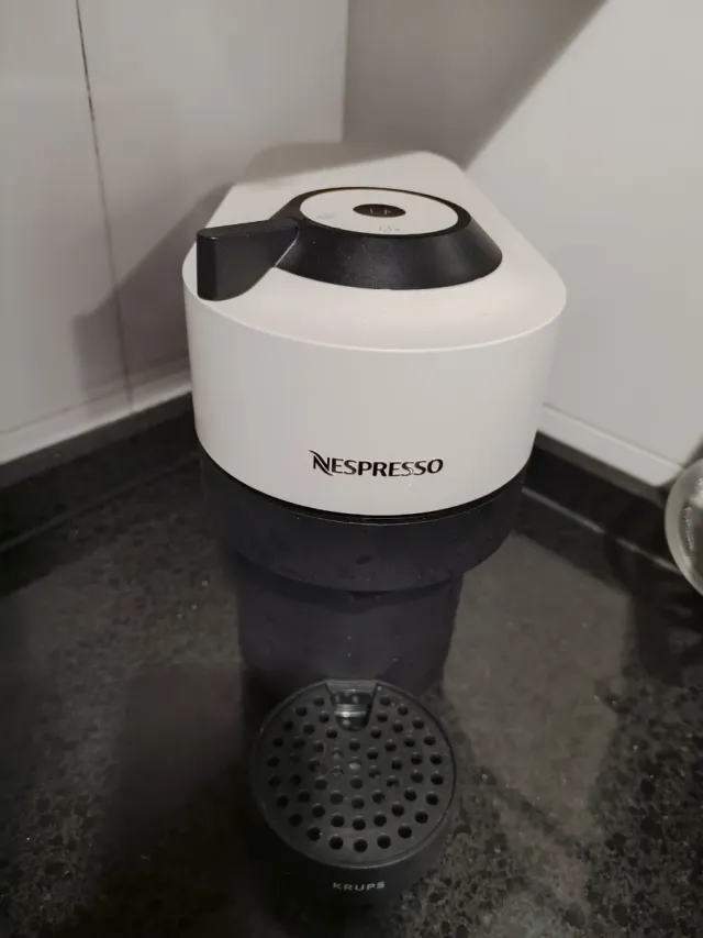 Detalles del productoCafetera Nespresso Vertuo Pop en color blanco y negro. Diseño moderno y compacto.